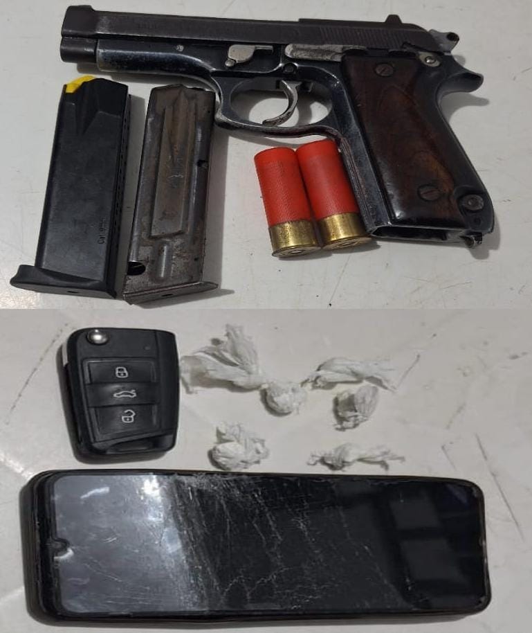 Com o imputado de iniciais J.F.D.S., foi encontrada 01 Pistola calibre 7.65 com 01 carregador vazio, 01 carregador de pistola calibre 9 mm e 02 munições calibre 12.