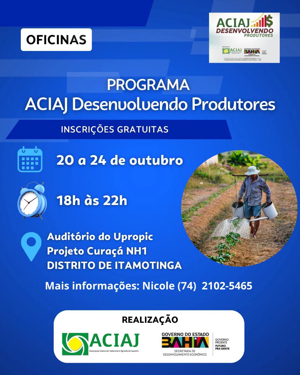 A Associação Comercial, Industrial e Agrícola de Juazeiro (Aciaj) realiza, de 20 a 24 de outubro, mais uma etapa do Programa Aciaj Desenvolvendo Produtores, com oficinas voltadas ao fortalecimento e à capacitação dos agricultores do Distrito de Itamotinga.