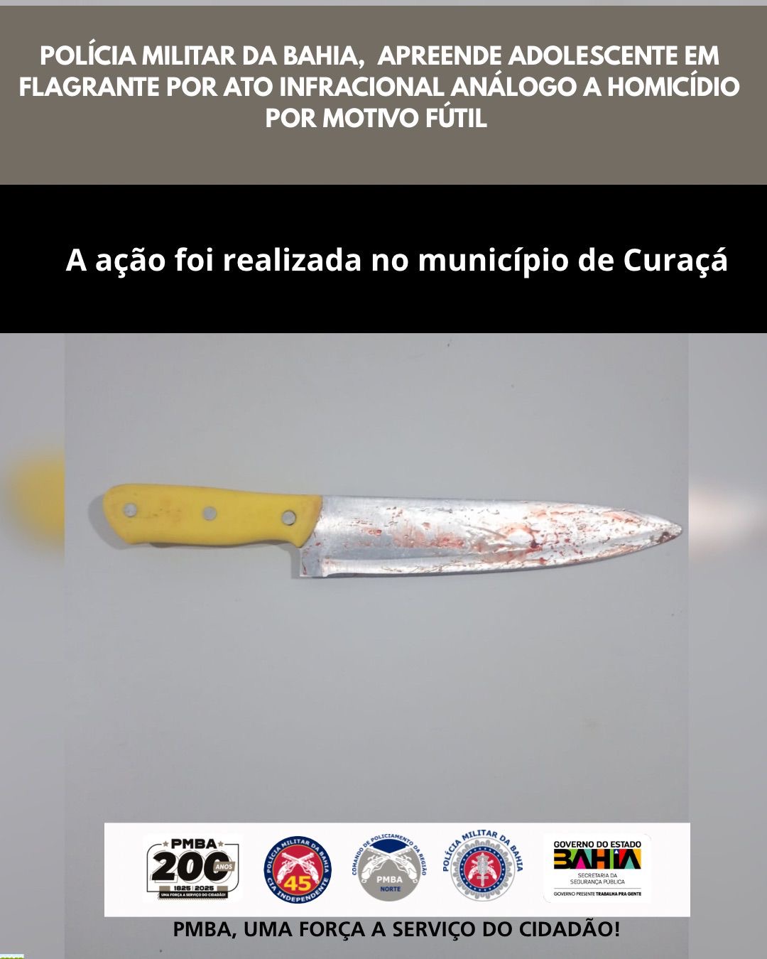 A Polícia Militar da Bahia, por intermédio da 45ª Companhia Independente de Polícia Militar (CIPM)/Curaçá, realizou, nesta quinta-feira (22), a apreensão em flagrante de um adolescente, pela prática de ato infracional análogo ao crime de homicídio, no município de Curaçá.