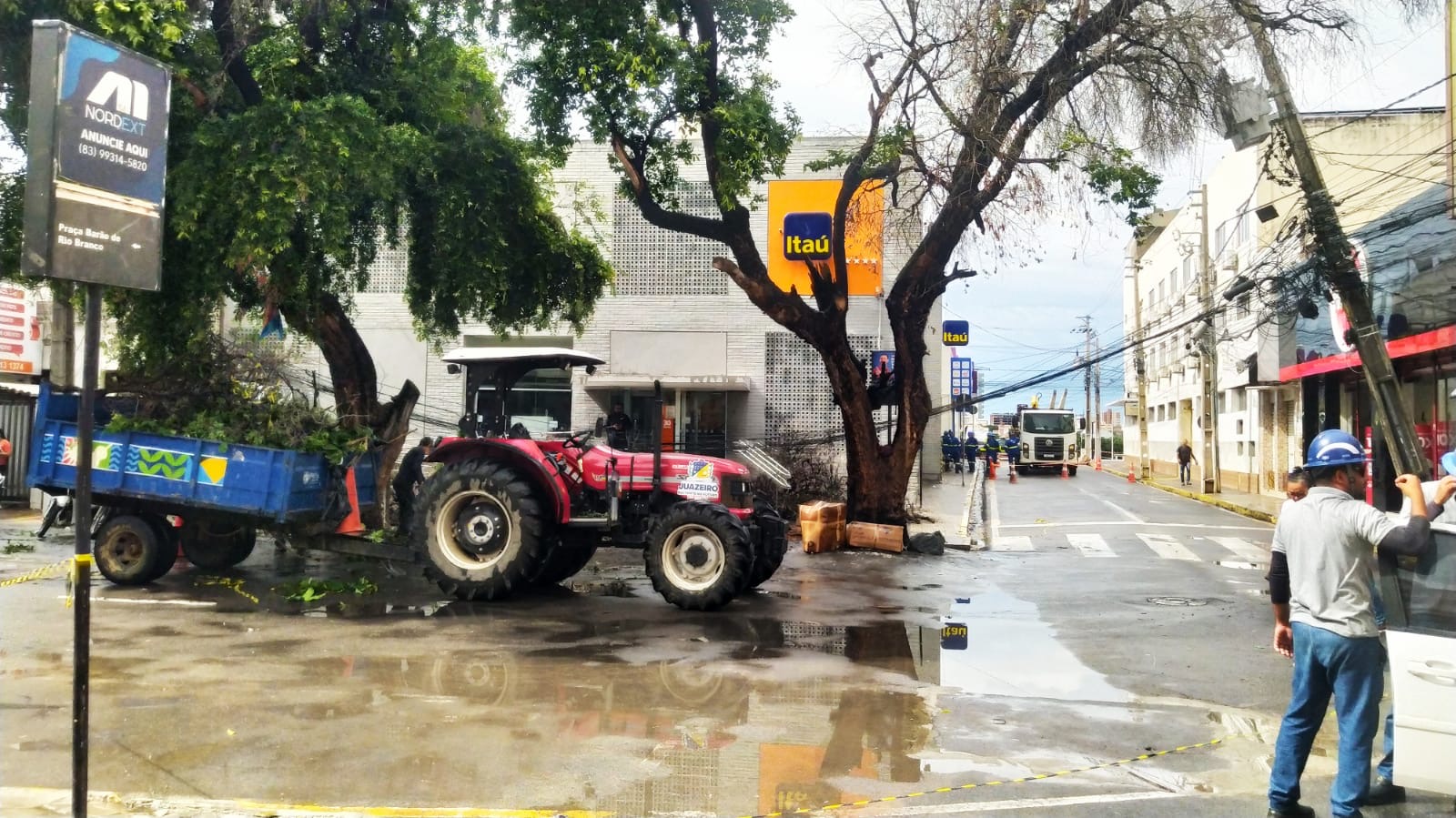 Uma árvore caiu e interditou o trânsito no setor bancário de Juazeiro, na manhã desta quarta-feira (4). A queda ocorreu em frente ao Banco Itaú, no centro da cidade, e foi provocada pelas fortes chuvas que atingiram o município. Com o impacto, a árvore acabou puxando fios de energia e de internet, derrubando também um poste.