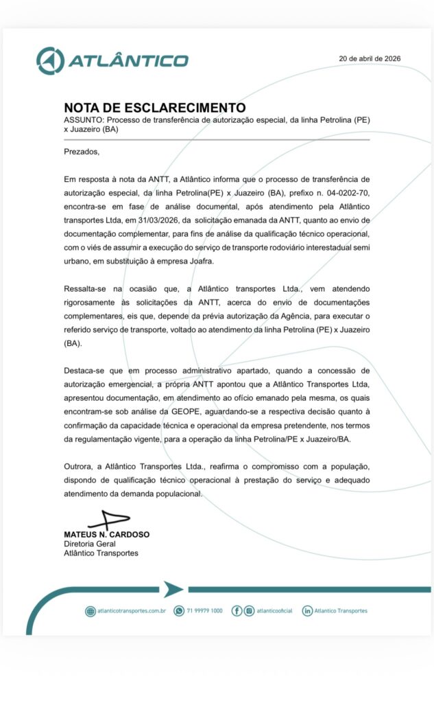 Na nota enviada a Atlântico ainda declara que – “Destaca-se que em processo administrativo apartado, quando a concessão de autorização emergencial, a própria ANTT apontou que a Atlântico Transportes Ltda, apresentou documentação, em atendimento ao ofício emanado pela mesma, os quais encontram-se sob análise da GEOPE, aguardando-se a respectiva decisão quanto à confirmação da capacidade técnica e operacional da empresa pretendente, nos termos da regulamentação vigente, para a operação da linha Petrolina/PE x Juazeiro/BA.