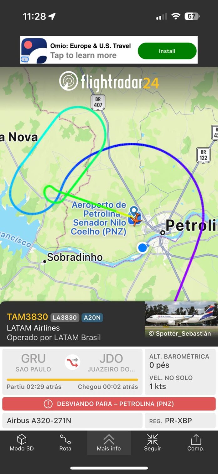 Um avião da LATAM Airlines Brasil que partiu de Guarulhos (SP) com destino a Juazeiro do Norte (CE) precisou realizar um pouso de emergência no Aeroporto Internacional Senador Nilo Coelho, em Petrolina (PE), na manhã deste sábado (4).