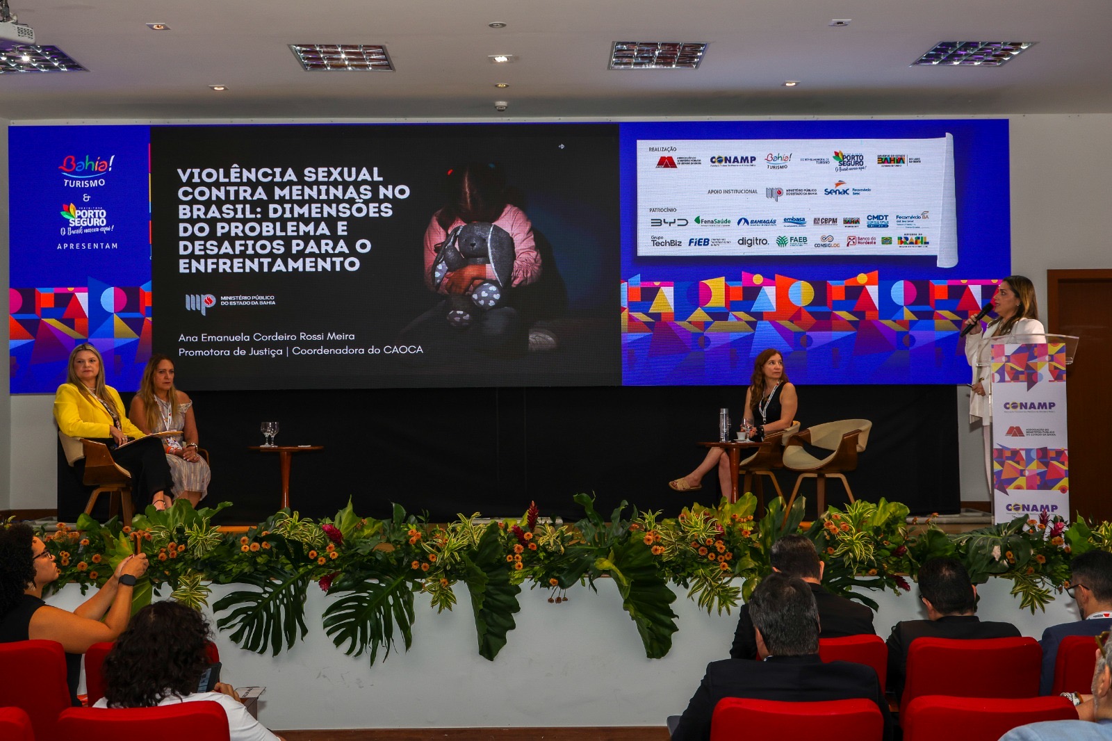 Durante o XV Congresso Estadual do Ministério Público da Bahia, ocorrido em Porto Seguro, a violência contra as mulheres, inclusive relacionada a crianças e adolescentes, foi discutida em painel com as promotoras de Justiça baianas Sara Gama e Ana Emanuela Rossi, com participação da promotora de Portugal Sônia Pinela e mediação da procuradora de Justiça da Bahia, Márcia Guedes.