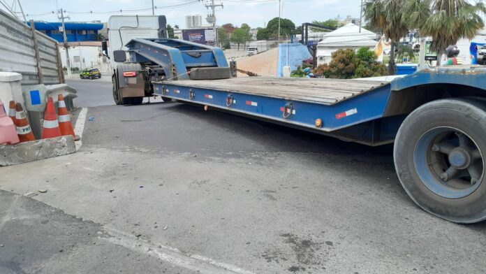 Um caminhão do tipo prancha ficou preso na manhã desta quarta-feira (19) ao tentar descer a rampa de acesso à Avenida Raul Alves, em Juazeiro. O local está com circulação proibida para veículos de grande porte por causa das obras da Travessia Urbana. A situação gerou congestionamento e chamou atenção de quem passava pela Ponte Presidente Dutra.