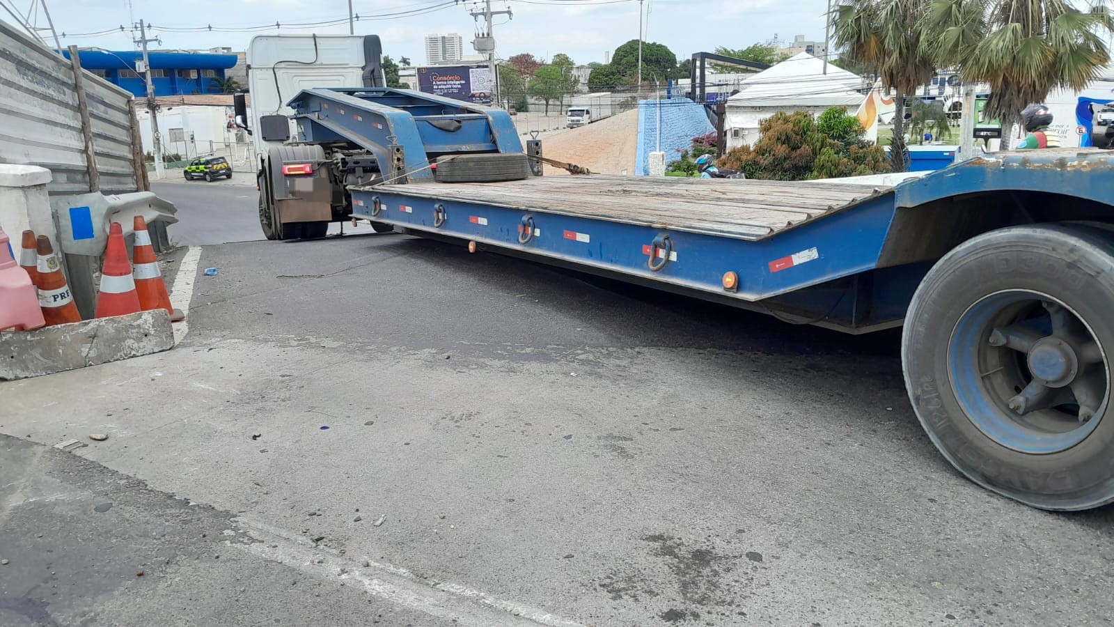 De acordo com a Polícia Rodoviária Federal (PRF), o motorista tinha uma Autorização Especial de Trânsito (AET), mas o documento deixava claro que o tráfego naquele ponto era proibido. Mesmo assim, ele tentou fazer a manobra e acabou enganchando a prancha na descida da rampa, danificando o pavimento e bloqueando parcialmente a via.