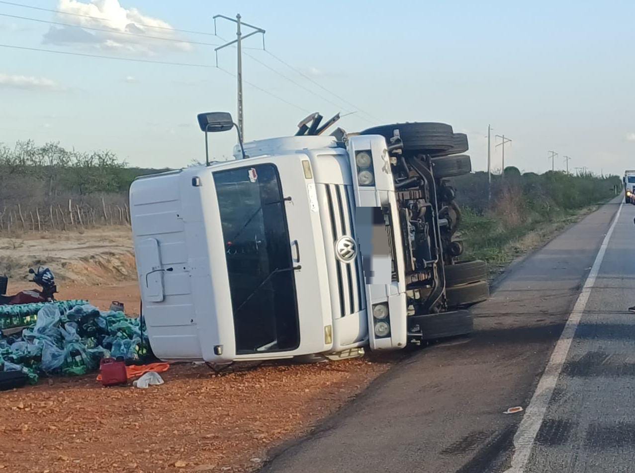 Um caminhão tombou na manhã da quinta-feira (5) no Km 82 da BR-407, em Petrolina, no Sertão de Pernambuco. Ninguém ficou ferido.