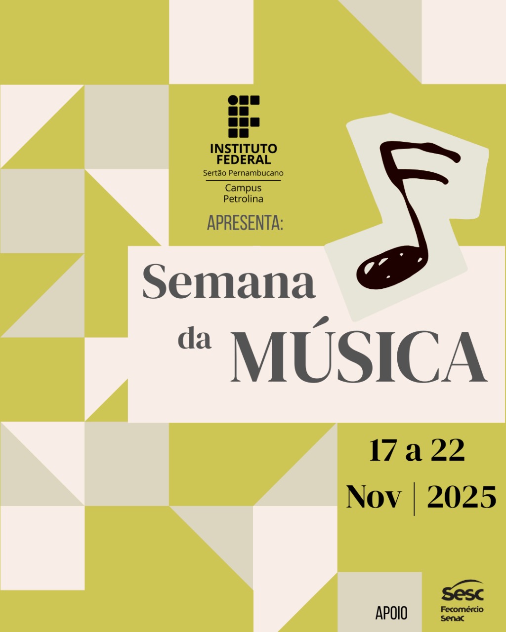 Entre os dias 17 e 22 de novembro, o Campus Petrolina do IFSertãoPE realizará a Semana da Música 2025, que levará ao Vale do São Francisco uma programação diversificada, totalmente aberta ao público, composta por recitais, concertos, apresentações instrumentais e ensaios abertos. O evento destaca a produção artística e pedagógica do curso de Licenciatura em Música e reforça o compromisso da instituição com a democratização do acesso à cultura.