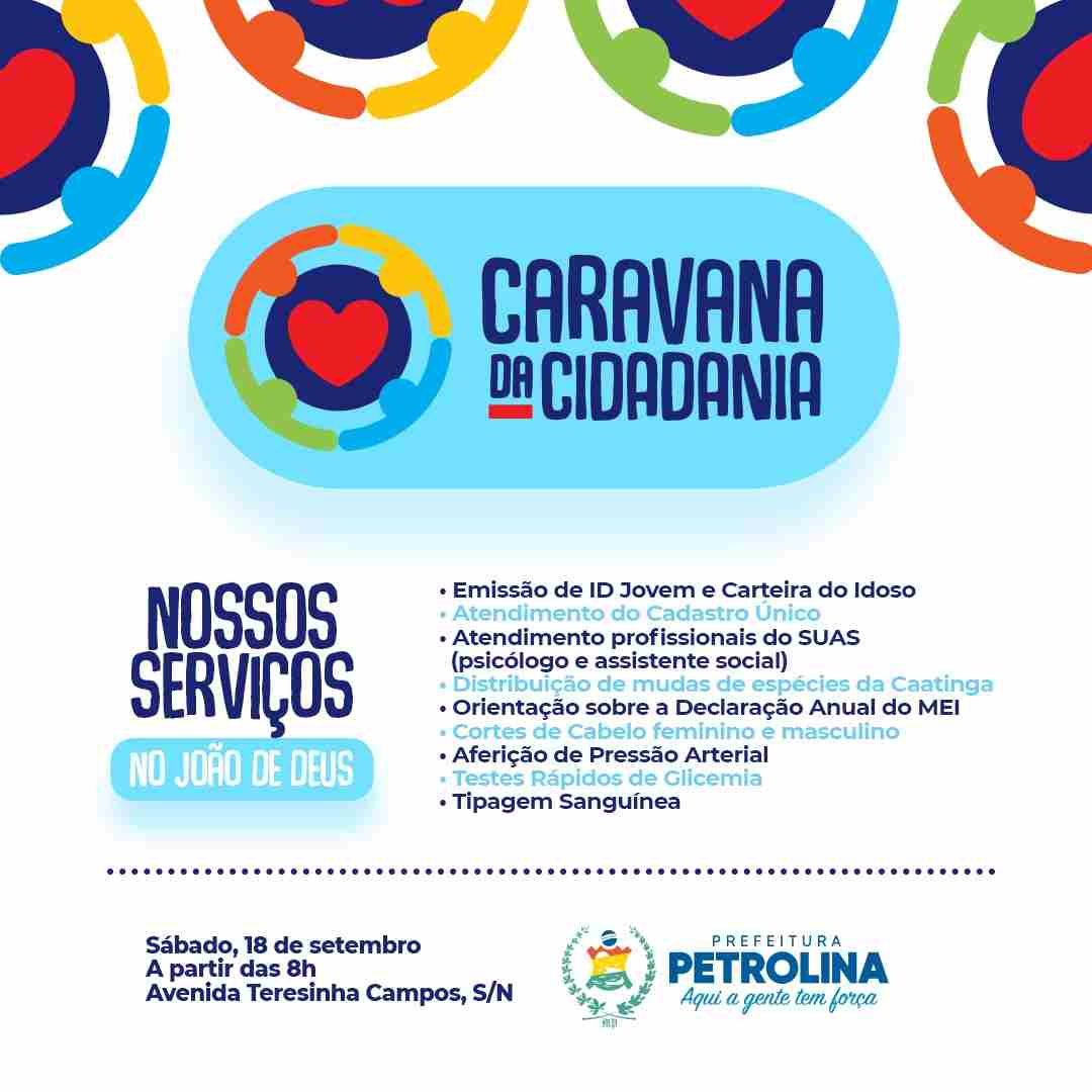 Após um período suspenso devido à pandemia, uma importante iniciativa da Prefeitura de Petrolina está de volta para levar diversos serviços às comunidades da cidade. Trata-se da ‘Caravana da Cidadania’, que no próximo sábado (18) retoma seu cronograma de ações começando pelo bairro João de Deus.