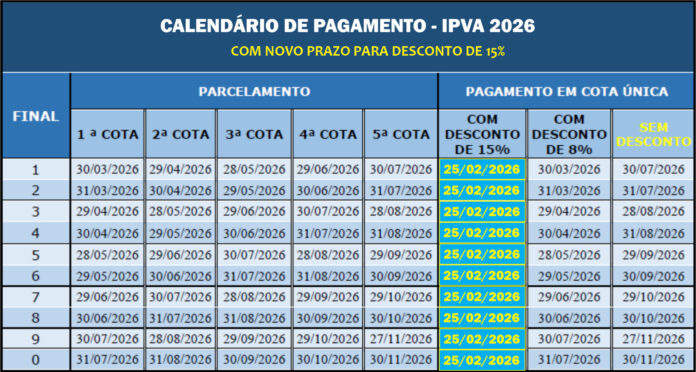 A Sefaz-Ba informa que, caso o contribuinte não possa fazer a quitação e aproveitar o desconto de 15% até o dia 25, ele tem ainda a opção de pagar o imposto com 8% de desconto, desde que faça o pagamento do valor integral até o dia do vencimento da primeira cota do parcelamento previsto para o seu veículo. Esta informação pode ser checada no calendário do IPVA 2026, disponível no site no www.sefaz.ba.gov.br, clicando-se em “Inspetoria Eletrônica” – “IPVA” – “Calendário”.