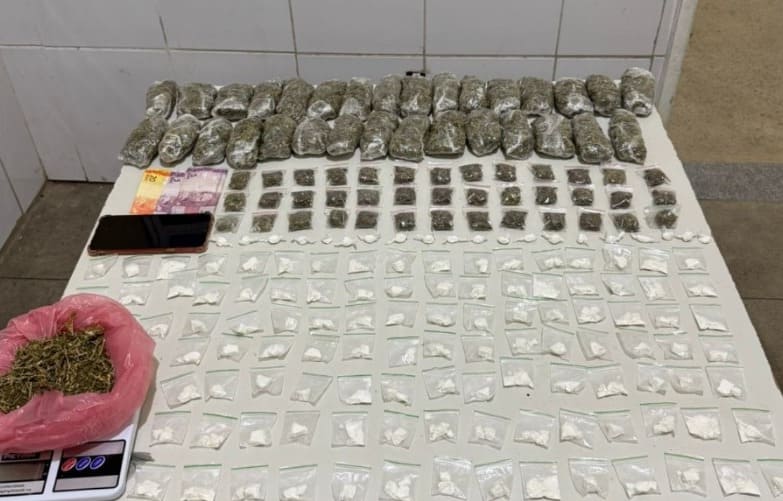 Após receberem informações sobre a ocorrência do ilícito, os policiais visualizaram dois indivíduos em atitude suspeita. Durante a abordagem, foram encontradas diversas embalagens contendo substâncias análogas à cocaína e à cannabis (maconha), além de uma balança de precisão e uma quantia em dinheiro.