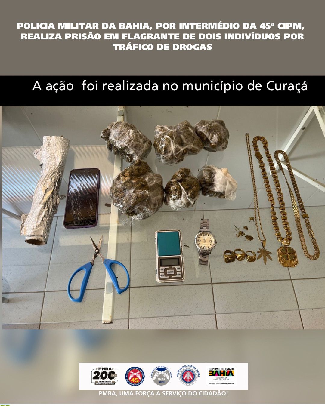 Na manhã desta sexta-feira (07), por volta das 11h30min, a Polícia Militar da Bahia, por intermédio da 45ª Companhia Independente de Polícia Militar (CIPM), realizou a prisão em flagrante de dois indivíduos suspeitos de tráfico de drogas no Bairro Nova Aliança, no município de Curaçá.