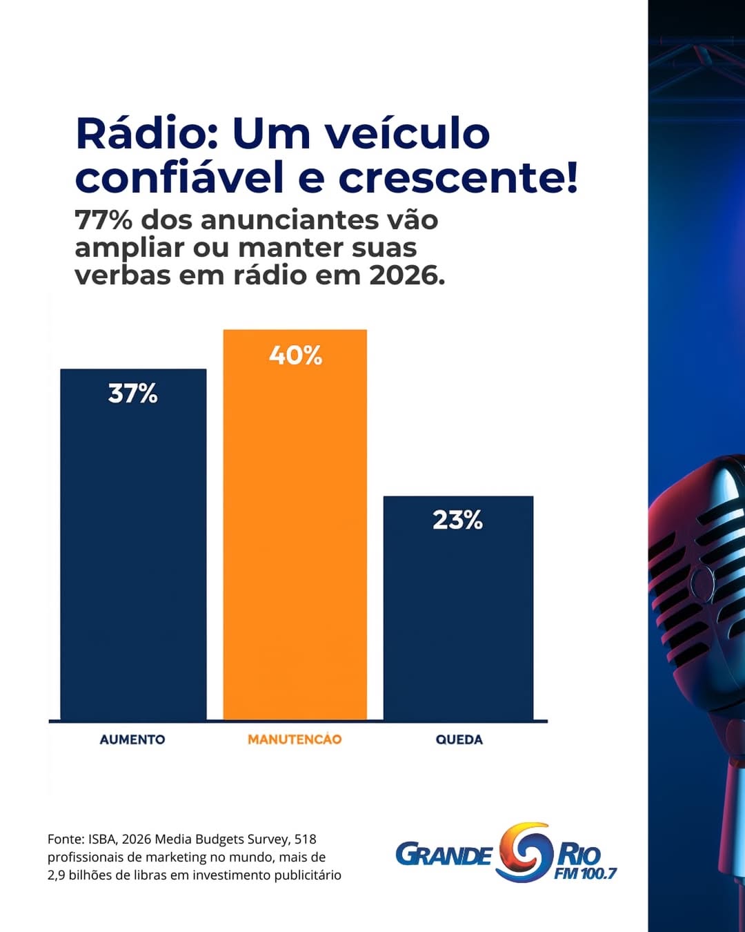 Além da transmissão em FM, a Grande Rio ampliou sua presença no ambiente digital com streaming, redes sociais e aplicativos, combinando o alcance tradicional do rádio com novas formas de consumo de conteúdo. Esse modelo híbrido potencializa o recall de marca e entrega exatamente o que o mercado volta a priorizar em 2026: construção de marca com custo-benefício competitivo.