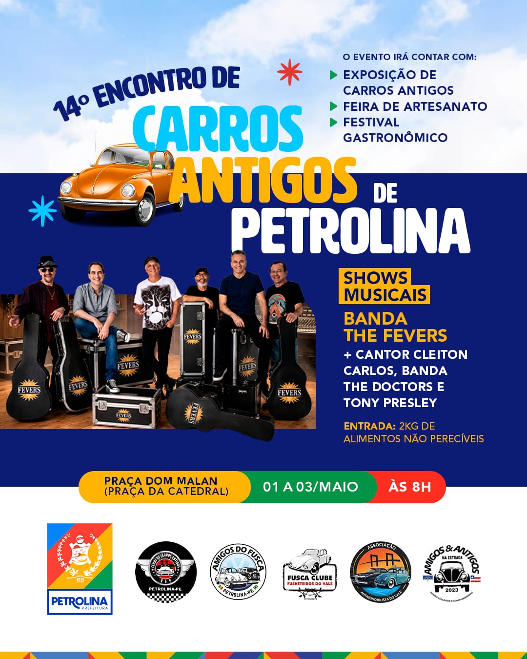 Além das relíquias automotivas, a programação cultural é um dos grandes atrativos, com apresentações musicais ao longo dos dias de evento, *o público ainda vai contar com* festival gastronômico e feira de artesanato, que valorizam a cultura e os empreendedores locais. Na sexta-feira (01), sobem ao palco Cleiton Carlos e a banda The Doctors. Já no sábado (02), o público poderá conferir o show de Tony Presley, seguido da banda The Fevers, principal atração do evento, que promete embalar o público com um repertório de sucessos que atravessam gerações.