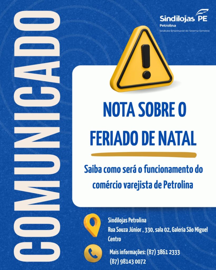 Este mês de Dezembro conta com um feriado nacional de quinta-feira (25), alusivo ao Natal. Em regra, o comércio varejista de Petrolina estará fechado. No entanto, de acordo com a Convenção Coletiva vigente, se o lojista resolver abrir o estabelecimento poderá fazê-lo, desde que se atente ao que prevê às cláusulas 48 e 49 da CCT.