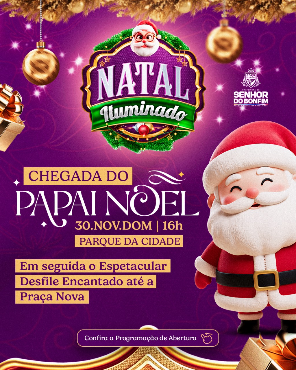 A magia do Natal vai tomar conta de Senhor do Bonfim! No domingo, dia 30 de novembro, a Prefeitura, por meio da Secretaria Municipal de Cultura, e em parceria com a Infornet, realiza a abertura oficial do Natal Iluminado 2025, com a tão esperada chegada do Papai Noel no Parque da Cidade, a partir das 16h.