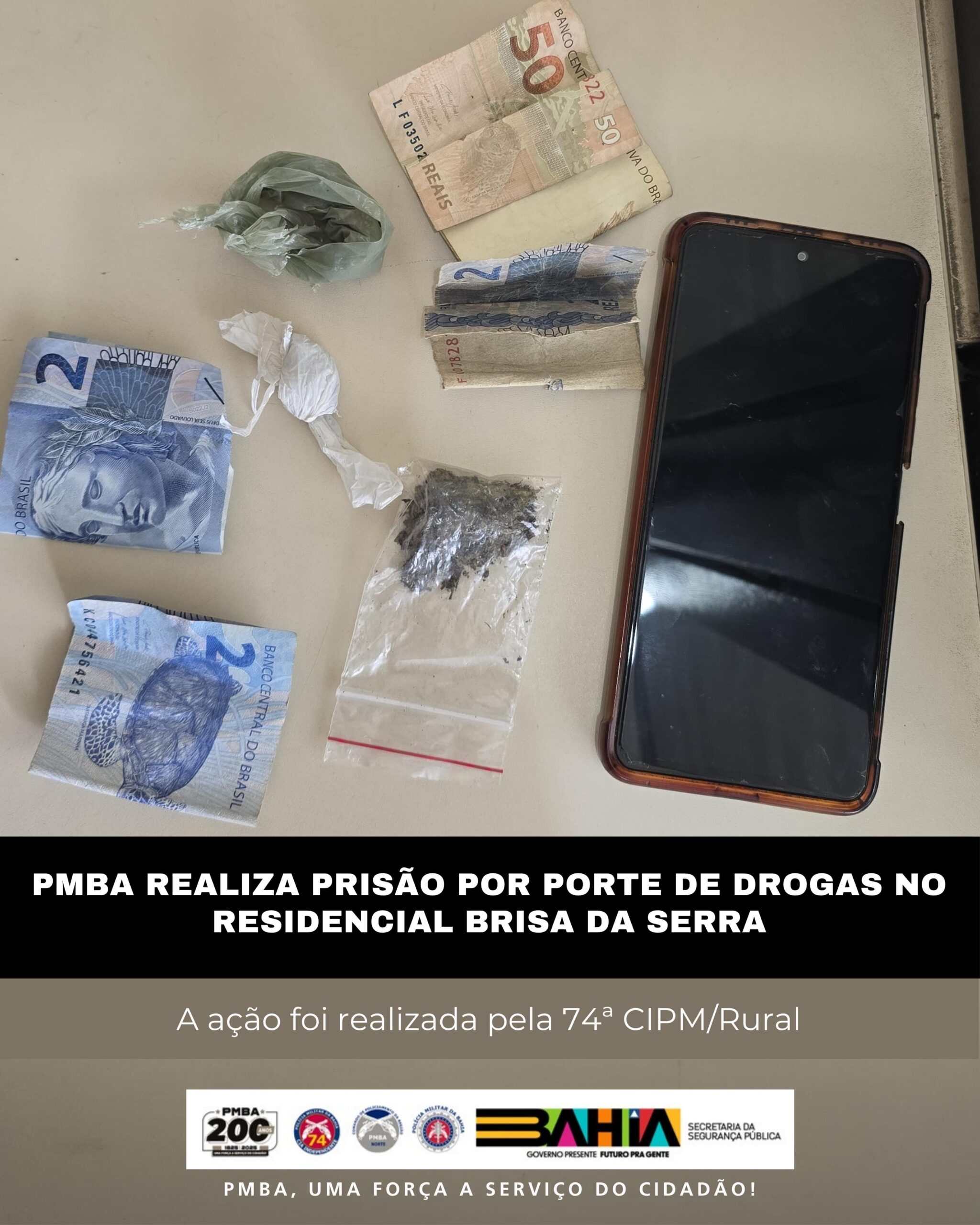 Nesta quinta-feira, 06 de novembro de 2025, durante rondas ostensivas no Residencial Brisa da Serra, em Juazeiro-BA, uma guarnição da 74ª CIPM/Rural prendeu um indivíduo que portava três dolões de maconha, a quantia de R$ 57,00 em espécie e um aparelho celular.