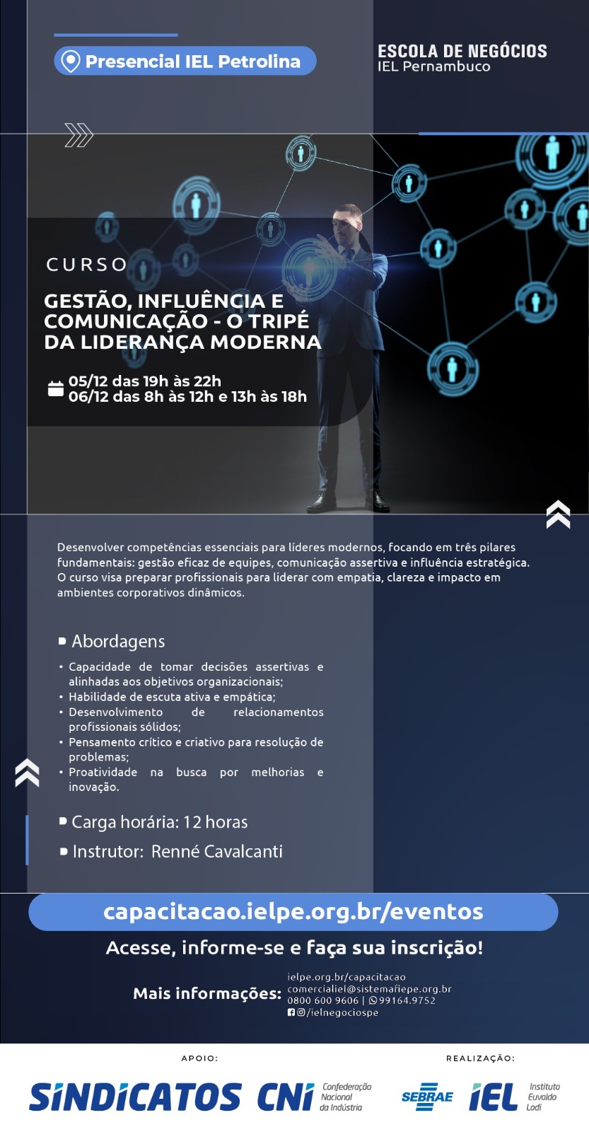 A Unidade Regional do Sertão do São Francisco do Instituto Euvaldo Lodi de Pernambuco (IEL-PE), vai ministrar em Petrolina, entre os dias 05 e 06 de dezembro, o curso Gestão, Influência e Comunicação – o Tripé da Liderança Moderna. A formação, com carga horária de 12h, tem como objetivo realizar a capacitação profissional de quem deseja atuar com excelência em ambientes organizacionais dinâmicos e desafiadores. As inscrições podem ser feitas através do site https://capacitacao.ielpe.org.br/lideranca-ursf-2025/.