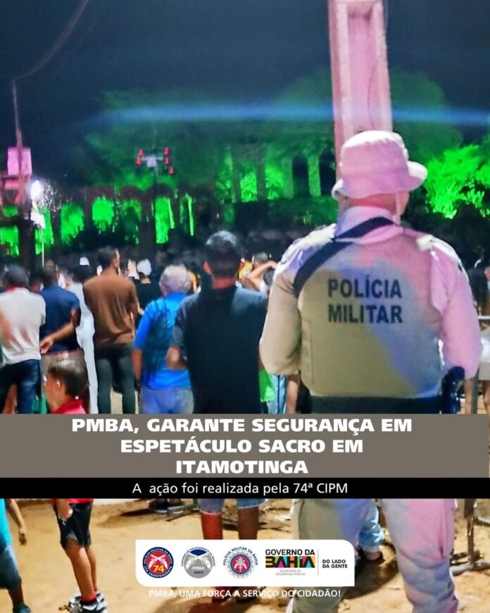 Na noite de 03 de abril de 2026, a Polícia Militar da Bahia, por meio da 74ª CIPM/Rural, realizou o policiamento do Espetáculo Sacro no Distrito de Itamotinga, em Juazeiro-BA, garantindo a segurança do evento sem registro de ocorrências.