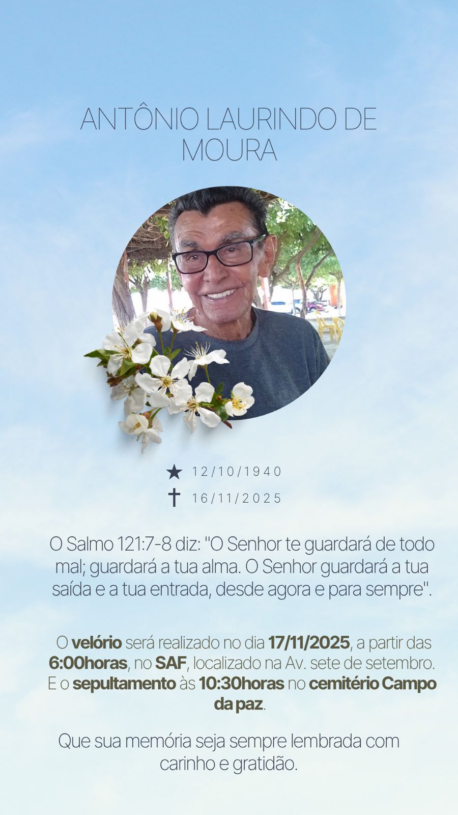Morreu neste domingo (16) Antonio Laurindo de Moura, pai da apresentadora da TV Grande Rio, Vanda Torres. Ele tinha 85 anos e, segundo a família, ele sofria com a Alzheimer e já vinha apresentando um estado de saúde debilitado nos últimos meses.