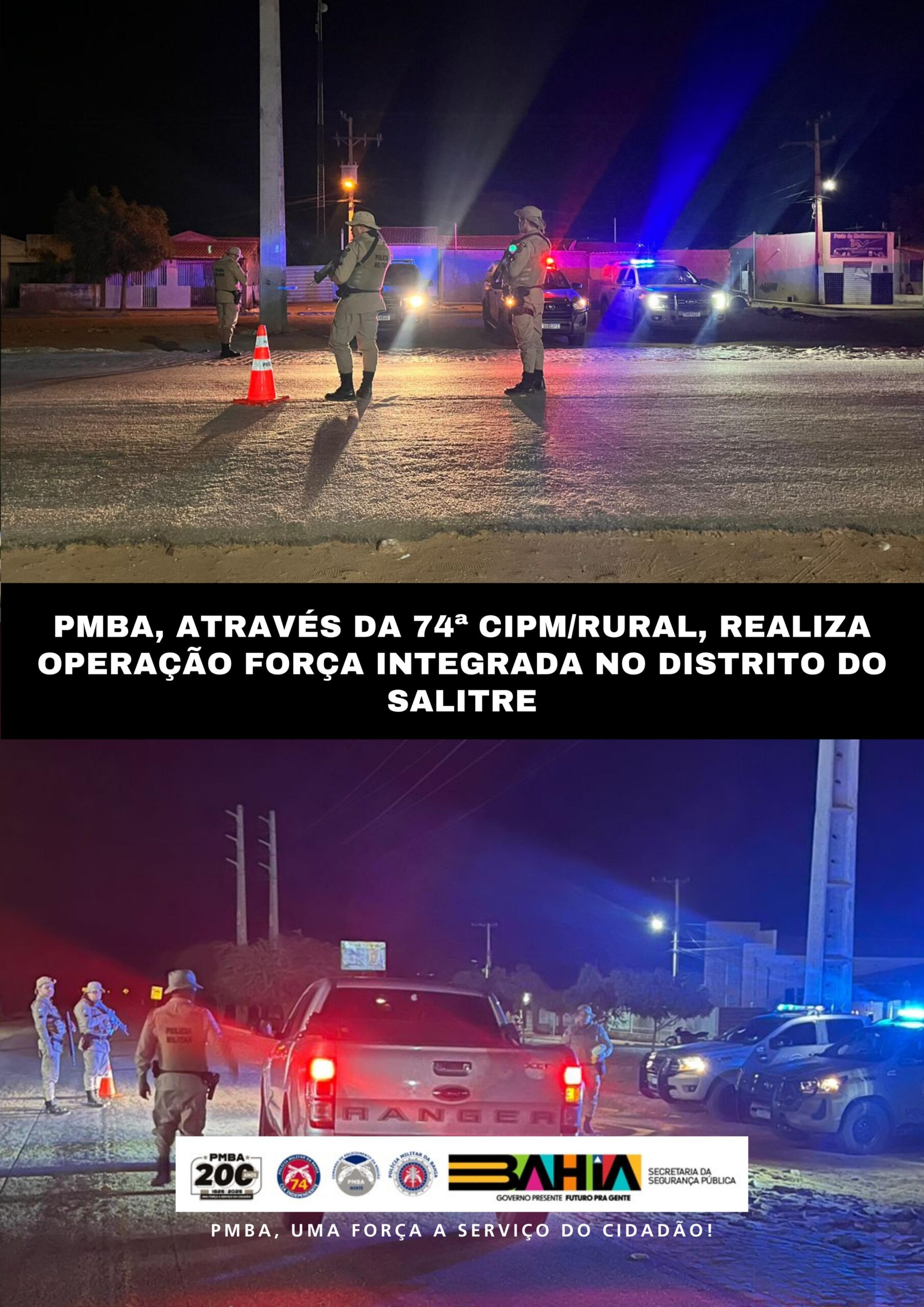 A Polícia Militar da Bahia, por meio da 74ª CIPM/Rural, realizou no dia 26 de dezembro de 2025 a Operação Força Integrada no Povoado dos Campos, localizado no distrito do Salitre, com o objetivo de intensificar o policiamento ostensivo, ampliar a sensação de segurança da população e prevenir a ocorrência de crimes na localidade.