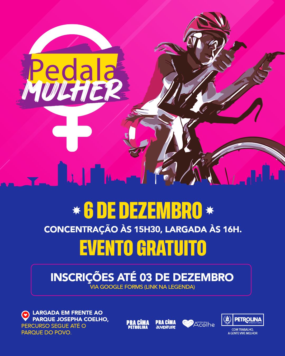 A Prefeitura de Petrolina, por meio da Secretaria de Assistência Social e Combate à Fome, realiza no próximo sábado, dia 6 de dezembro, o Pedala Mulher, um passeio ciclístico pensado especialmente para fortalecer a saúde feminina, incentivar a prática esportiva e promover integração entre mulheres de diferentes comunidades. A concentração será às 15h30, com largada às 16h, em frente ao Parque Josepha Coelho. A proposta vai muito além de um simples percurso: é um convite para que cada mulher ocupe a cidade, celebre sua força e vivencie momentos de bem-estar.