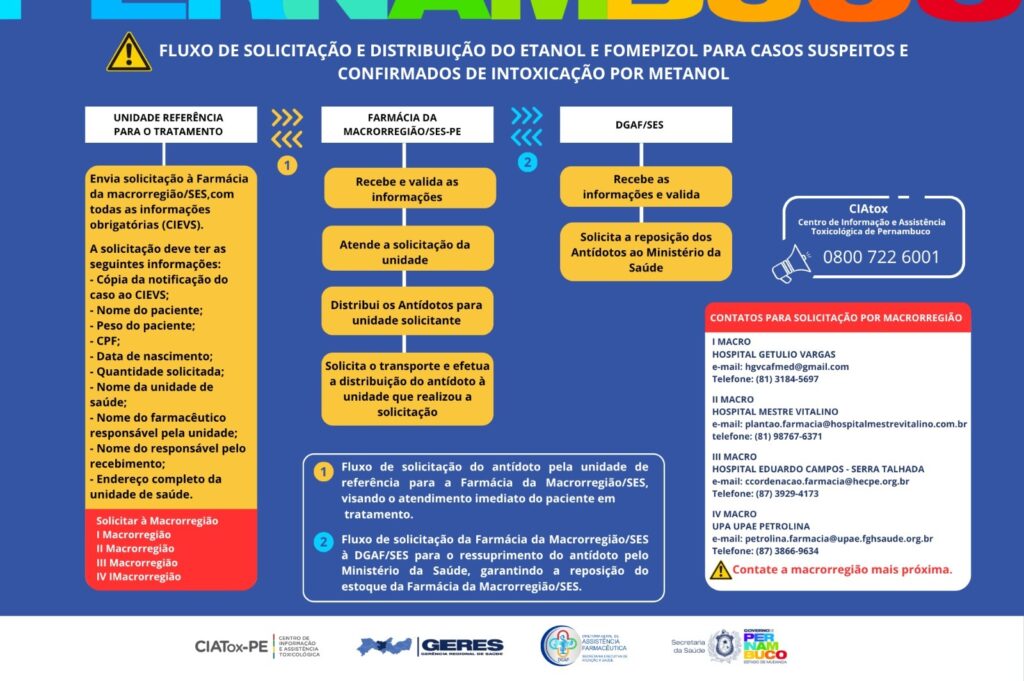 A SES-PE também esclareceu que, no interior do Estado, os Hospitais Regionais funcionam como referências para casos de média e alta complexidade envolvendo suspeita de intoxicação por metanol. O encaminhamento dos pacientes é feito pela Central de Regulação do Estado, conforme o quadro clínico e a região de origem do paciente.