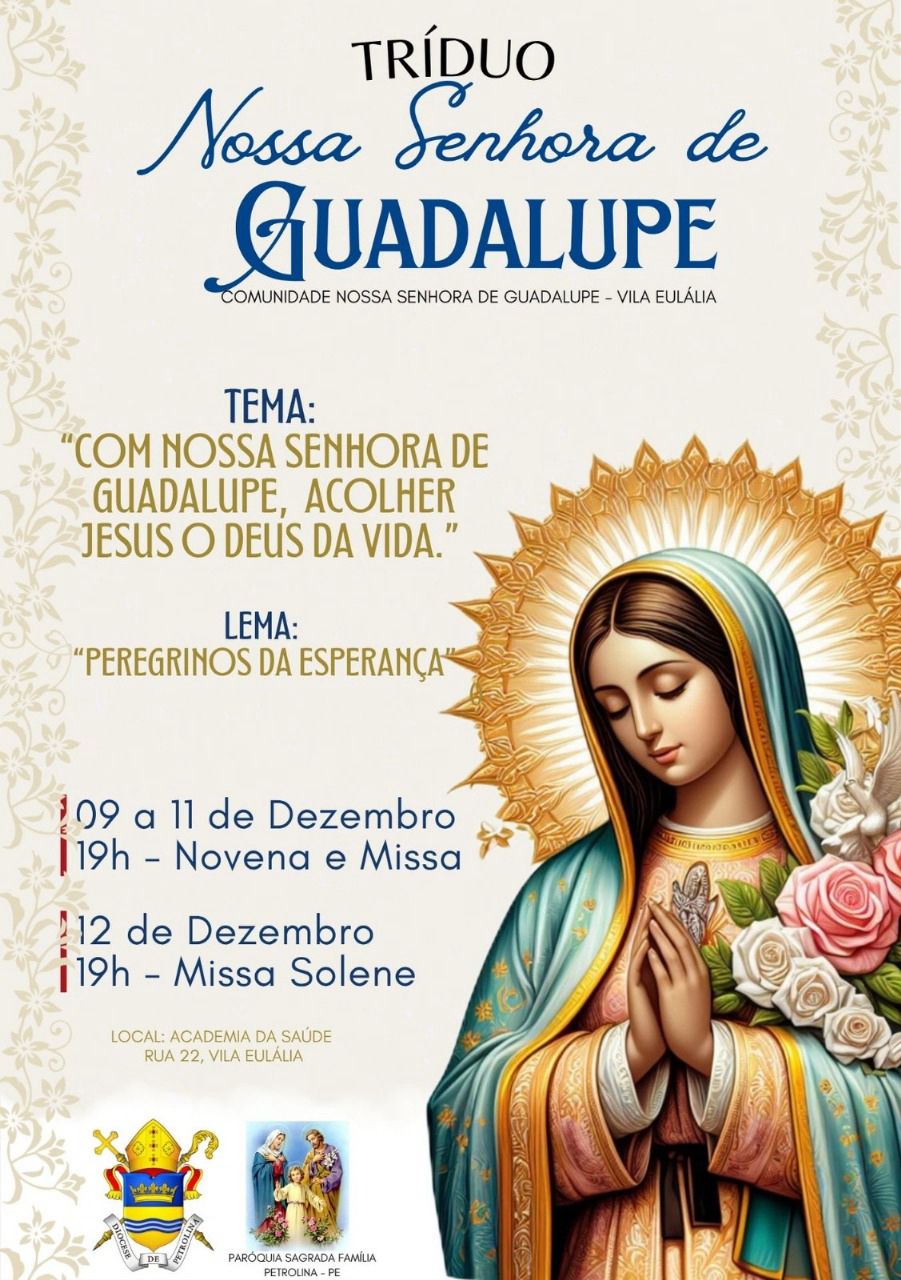 Começa na próxima terça-feira (09) e vai até o dia 12, na Vila Eulália, zona Norte de Petrolina, a festa em homenagem a Nossa Senhora de Guadalupe. A programação com novena, missa, benção e quermesse, vai acontecer na Academia da Saúde, a partir das 19h.