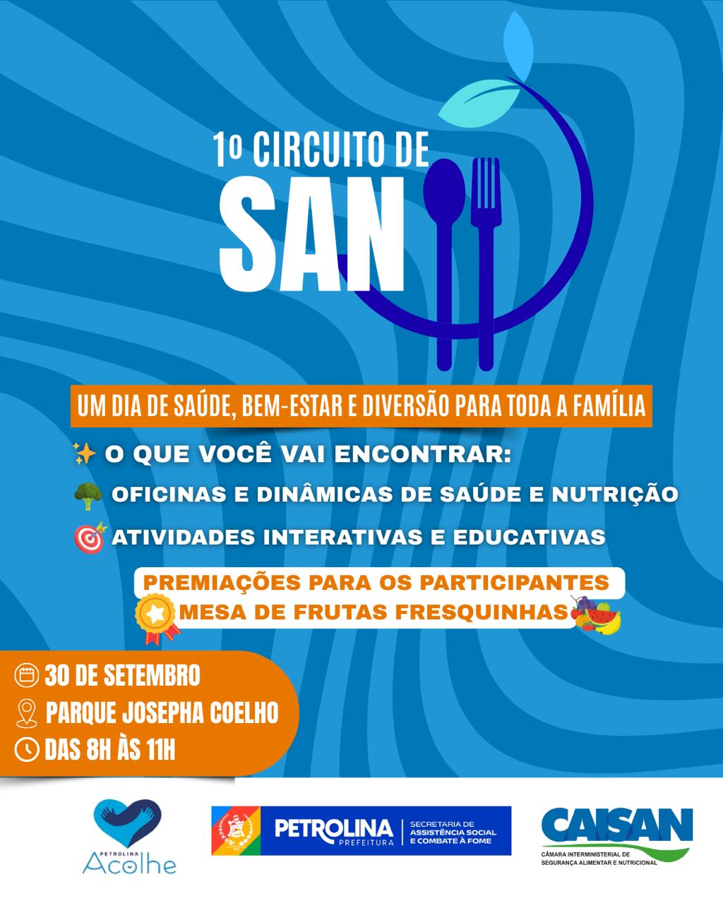 Nessa terça-feira (30), das 8h às 11h, o Parque Josepha Coelho será espaço de mobilização e cuidado com a saúde da população durante o 1º Circuito de Segurança Alimentar e Nutricional (SAN). A iniciativa é realizada pela Prefeitura de Petrolina, por meio da Secretaria de Assistência Social e Combate à Fome, em parceria com a Câmara Intersetorial de Segurança Alimentar e Nutricional (CAISAN), e busca despertar nos participantes a importância de práticas alimentares saudáveis, aliando conhecimento, sustentabilidade e qualidade de vida.