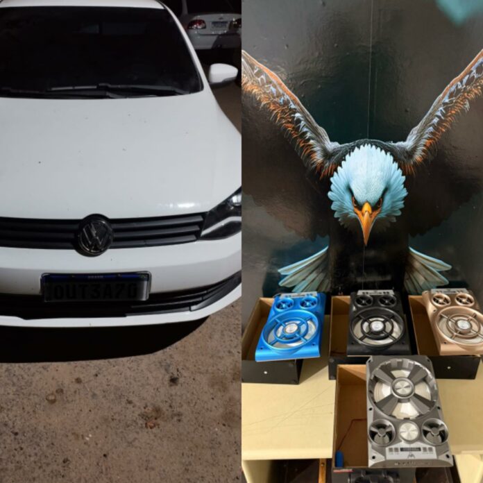 Durante a inspeção no veículo, um Volkswagen Voyage, os policiais encontraram oito tabletes de cocaína prensada, escondidos dentro de caixas de som.