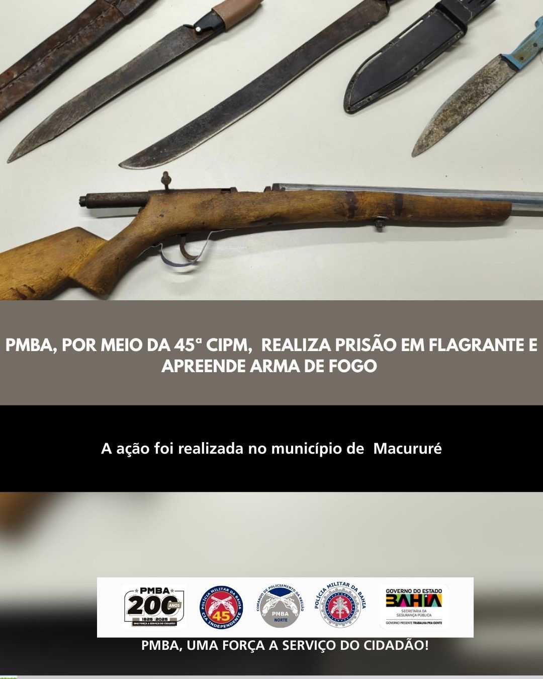 A Polícia Militar da Bahia (PMBA), por meio da 45ª Companhia Independente de Polícia Militar (CIPM)/Curaçá, realizou, nesta sexta-feira (20), a prisão em flagrante de um homem e a apreensão de uma arma de fogo no município de Macururé.
