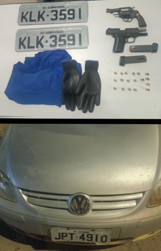 Com eles, foram apreendidas uma pistola calibre .40, um revólver calibre 38, 18 munições de diferentes calibres, dois carregadores, duas placas veiculares, um par de luvas, uma camisa e um veículo.