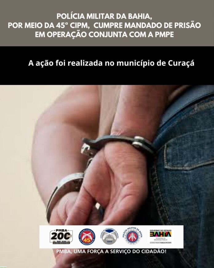 A Polícia Militar da Bahia, por meio da 45ª Companhia Independente de Polícia Militar (CIPM), em conjunto com a Polícia Militar de Pernambuco (PMPE), cumpriu um mandado de prisão no município de Curaçá.