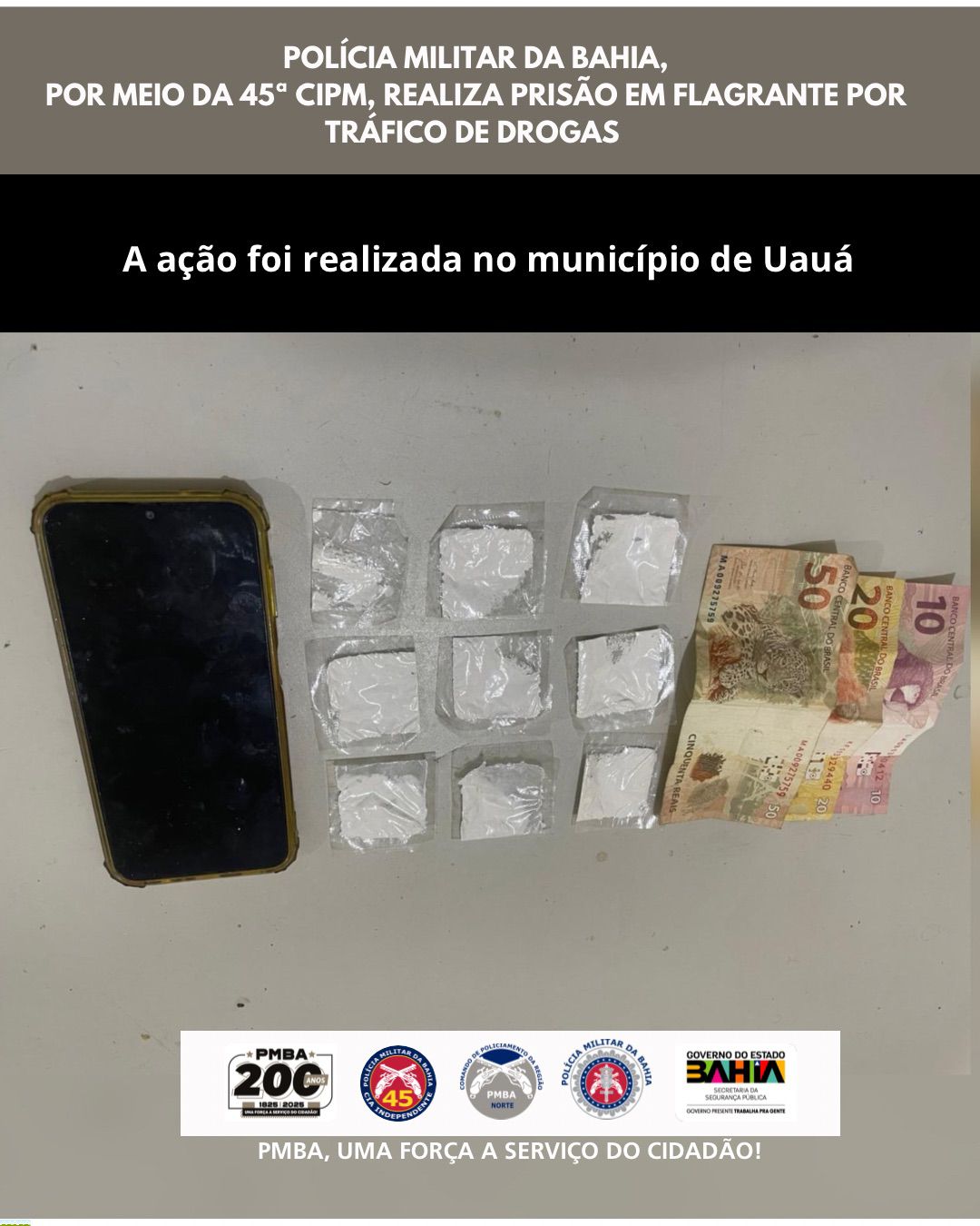 Policiais militares da Bahia, por meio da 45ª Companhia Independente de Polícia Militar (CIPM), realizaram, neste domingo (21), uma prisão em flagrante por tráfico de drogas no município de Uauá.