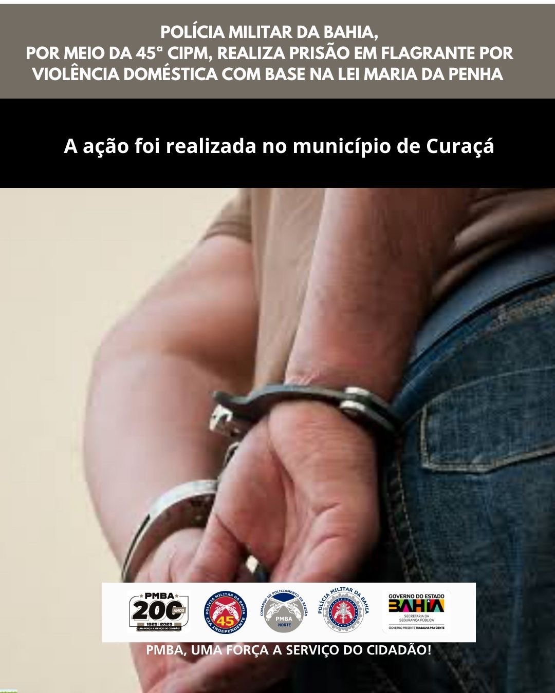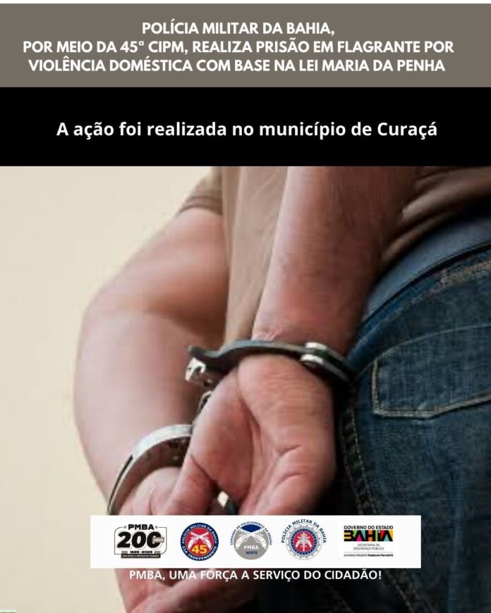 A Polícia Militar da Bahia (PMBA), por meio da 45ª Companhia Independente de Polícia Militar (CIPM), realizou a prisão em flagrante por violência doméstica no município de Curaçá.