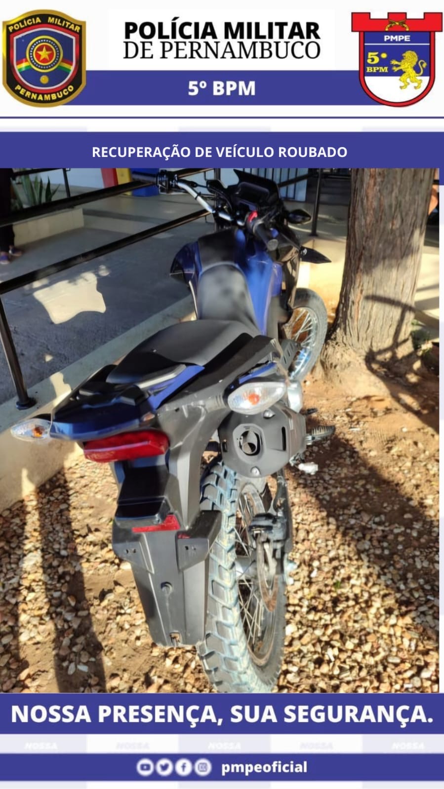 Por volta das 15h deste sábado (04), durante a Operação Força Total, a equipe do Grupamento Tático GE 5.250 do 5ºBPM foi solicitada pela vítima que informou ter localizado sua moto no Núcleo 5 do Projeto Senador Nilo Coelho, zona rural de Petrolina, onde dias atrás teria sido furtada.