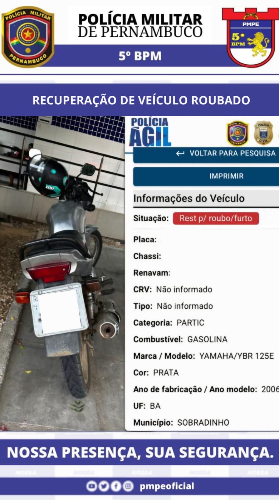 Por volta das 16h desta sexta-feira (27), durante a Operação Força Total, as equipe das GEs TÁTICO 5.250 e 5.251 do 5ºBPM, em rondas no Projeto C-3, zona rural de Petrolina, realizaram a abordagem a um indivíduo que se encontrava conduzindo uma motocicleta.