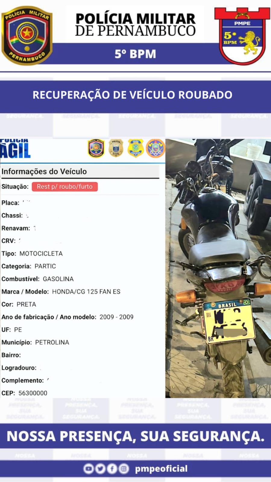 Nessa quarta-feira (08), durante a OPERAÇÃO SENTINELA, as equipes GE Tático 5.250 e GT OPERAÇÕES, lograram êxito na recuperação de um veículo que foi roubado no bairro São Rafael, e que foi recuperado no bairro Portal da Cidade, em Petrolina.