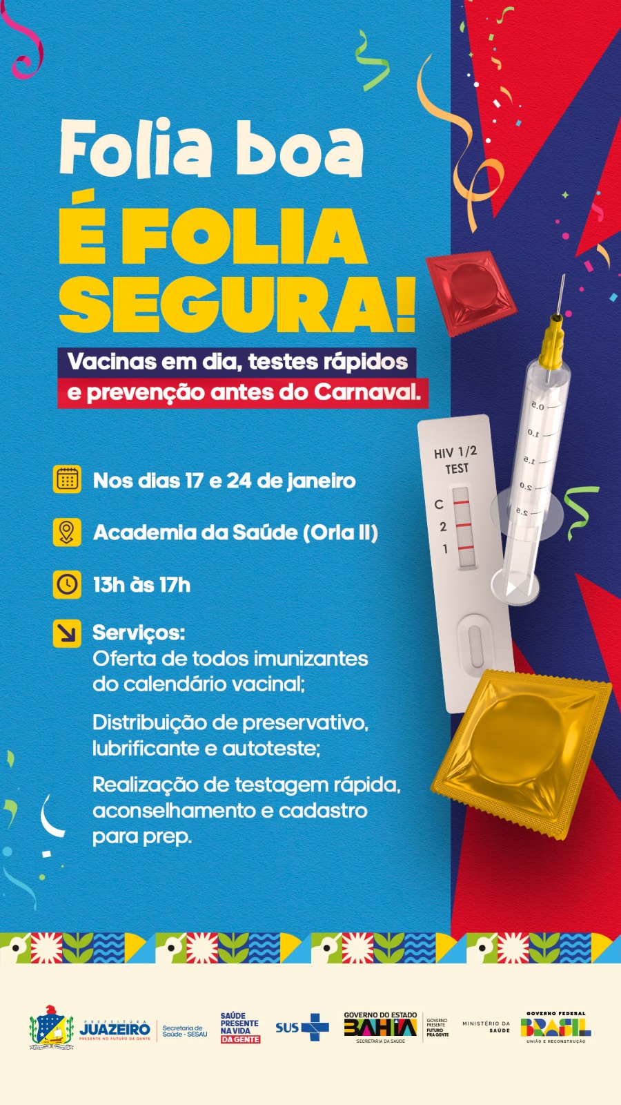 O público também terá acesso à distribuição de preservativos masculinos e femininos, lubrificantes e autotestes, fortalecendo as estratégias de prevenção combinada e incentivando práticas seguras durante o período festivo.