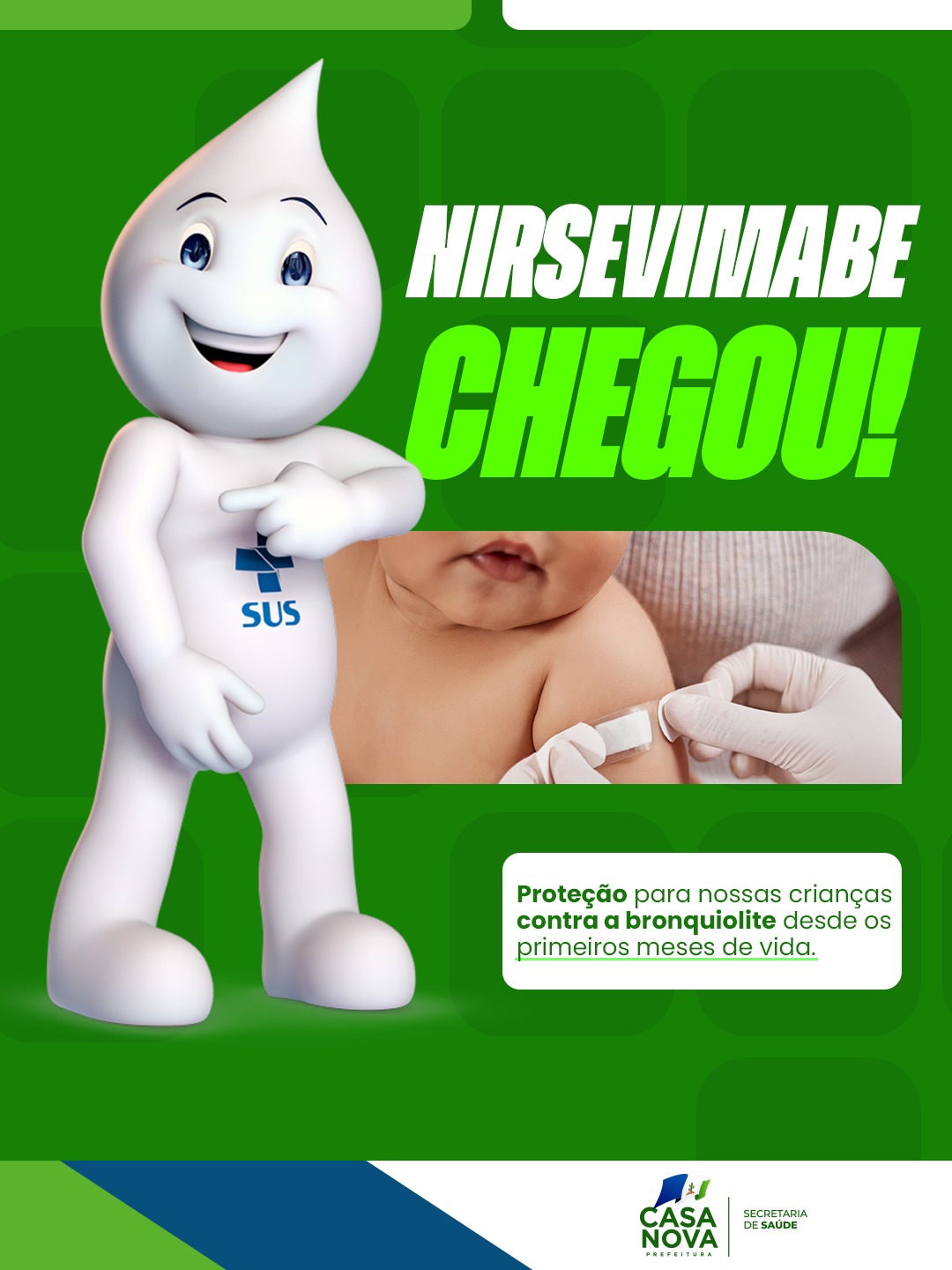 A Prefeitura de Casa Nova, por meio da Secretaria Municipal de Saúde, informa que o imunizante Nirsevimabe já está disponível na rede municipal de saúde. A aplicação é destinada à proteção de crianças contra a bronquiolite, especialmente nos primeiros meses de vida, período de maior vulnerabilidade às complicações respiratórias.