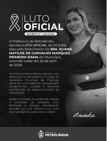 “Neste momento de profunda tristeza, o município de Petrolândia decreta luto oficial de 03 dias e se une em solidariedade aos familiares, amigos e a todos que tiveram o privilégio de conviver com a Sra. Eliana Matilde de Carvalho Marques, carinhosamente conhecida por Aninha”, diz a nota oficial da Prefeitura Municipal.