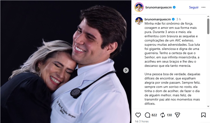 Nas redes sociais, um dos filhos da primeira Dama, o médico, Bruno Marques, prestou homenagem à mãe. “Durante três anos e meio, ela enfrentou com bravura as sequelas de um AVC extenso, superou muitas adversidades. Sua luta foi gigante, silenciosa, digna de uma guerreira”, relatou. “Levo comigo o maior amor que já senti e a mais profunda admiração que alguém pode ter. Sua história não termina aqui, porque tudo o que ela foi continua vivo em mim, nos ensinamentos, nos gestos e na forma de viver”, compartilhou Bruno.