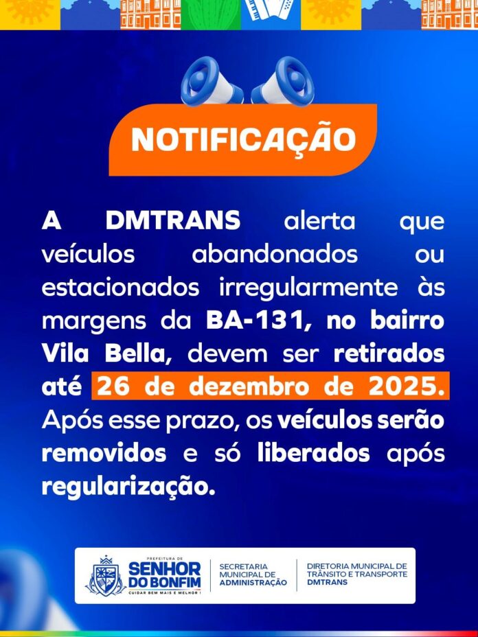 A Diretoria Municipal de Trânsito e Transportes (DMTRANS), notificou nesta sexta-feira (19) os proprietários de veículos que se encontram às margens da BA-131, no bairro Vila Bella, em estado de sucata, abandono, mau estado de conservação ou estacionados em locais não regulamentados, para que realizem a retirada no prazo de até cinco dias úteis.