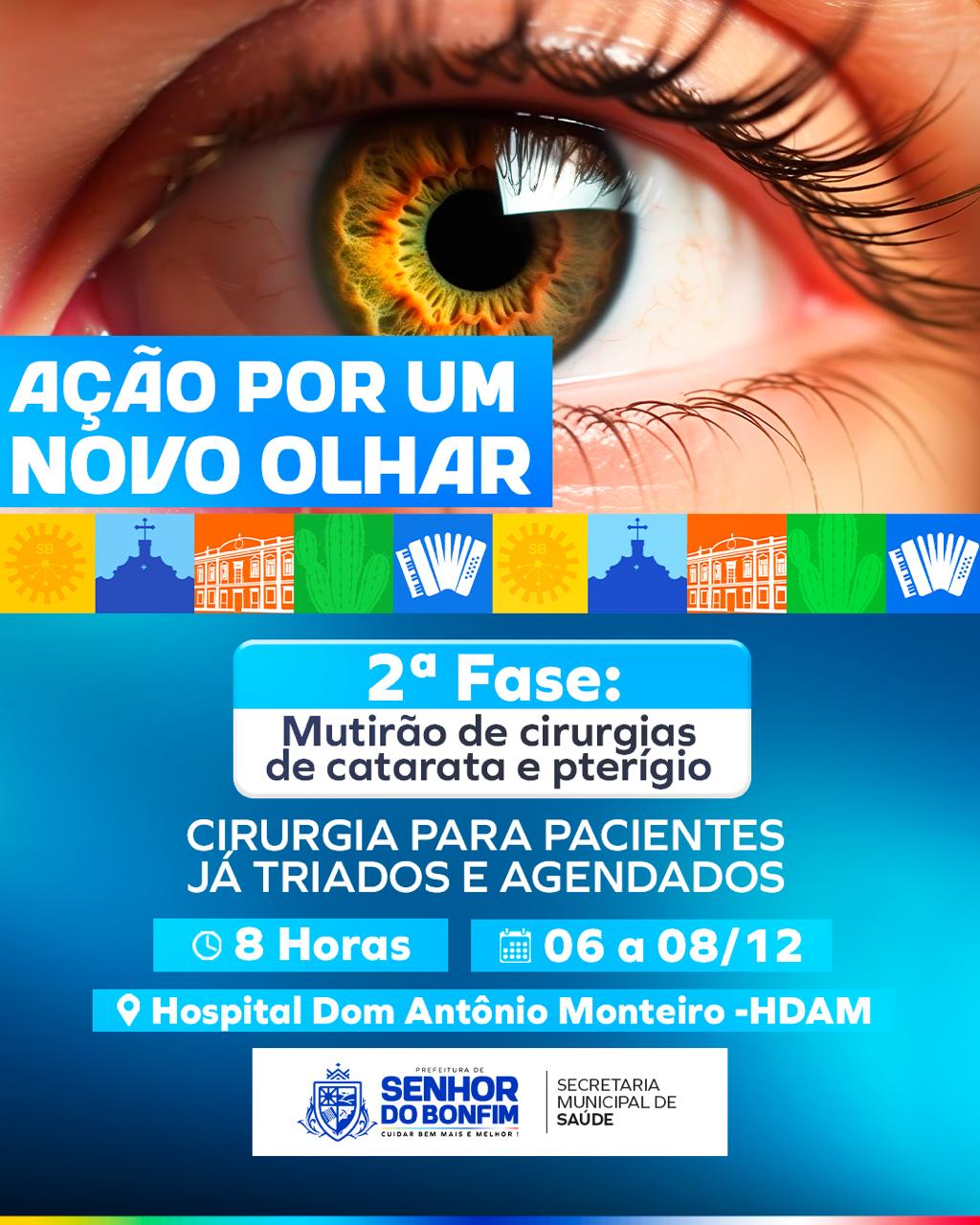 A Prefeitura de Senhor do Bonfim, por meio da Secretaria Municipal de Saúde, realiza nos dias 6, 7 e 8 de dezembro a segunda etapa do projeto Por Um Novo Olhar, com um grande mutirão de cirurgias de catarata e pterígio. Os procedimentos serão realizados no Hospital Dom Antônio Monteiro, a partir das 8h, contemplando aproximadamente 600 pacientes já triados e agendados.
