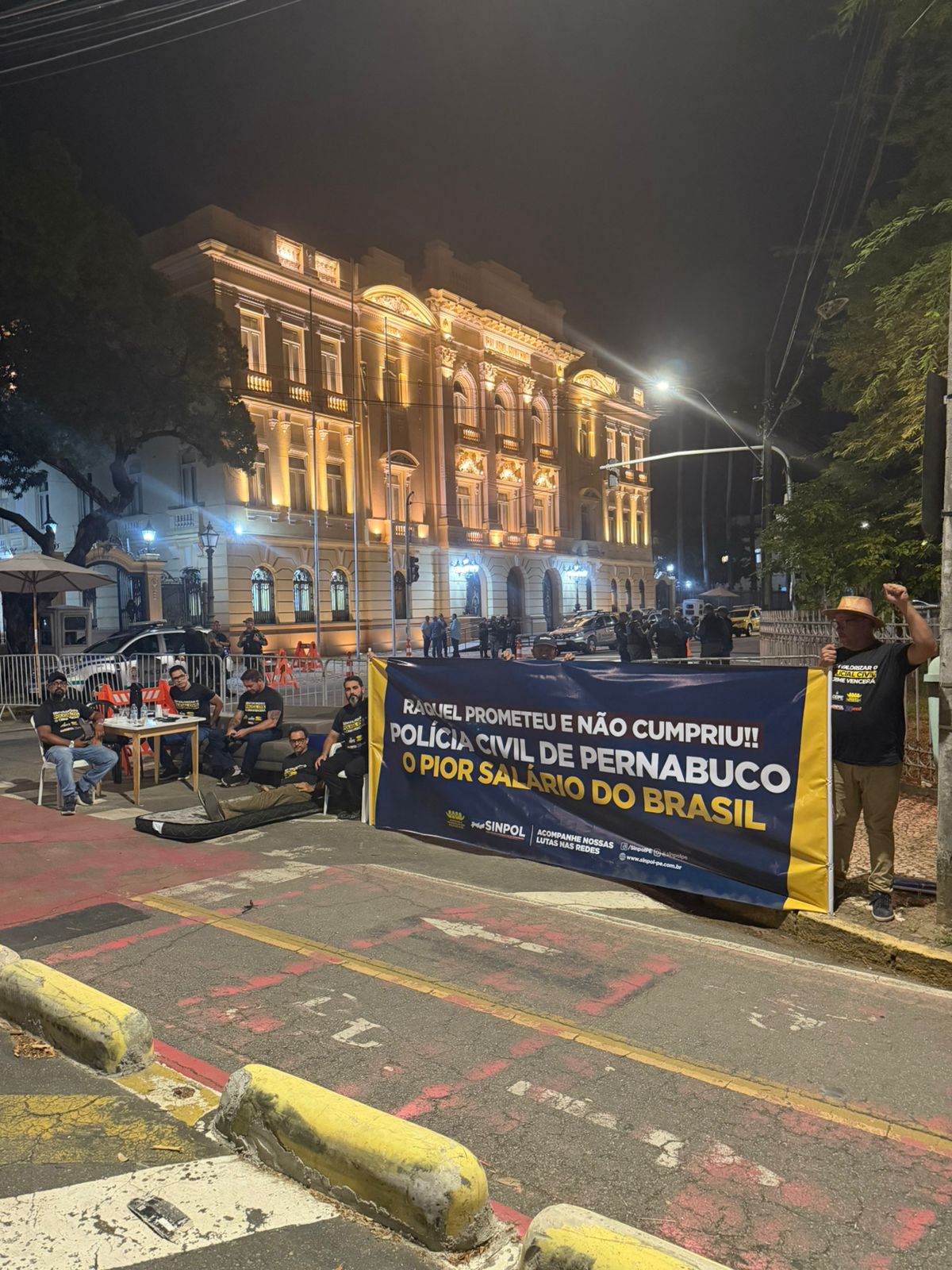 O Sindicato dos Policiais Civis de Pernambuco (Sinpol) montou um acampamento em frente ao Palácio do Campo das Princesas, na noite desta segunda-feira (16), cobrando uma promessa de reunião feita pela governadora Raquel Lyra. Em nota divulgada nas redes sociais, a entidade afirma que a gestora voltou a descumprir compromisso assumido com a categoria.