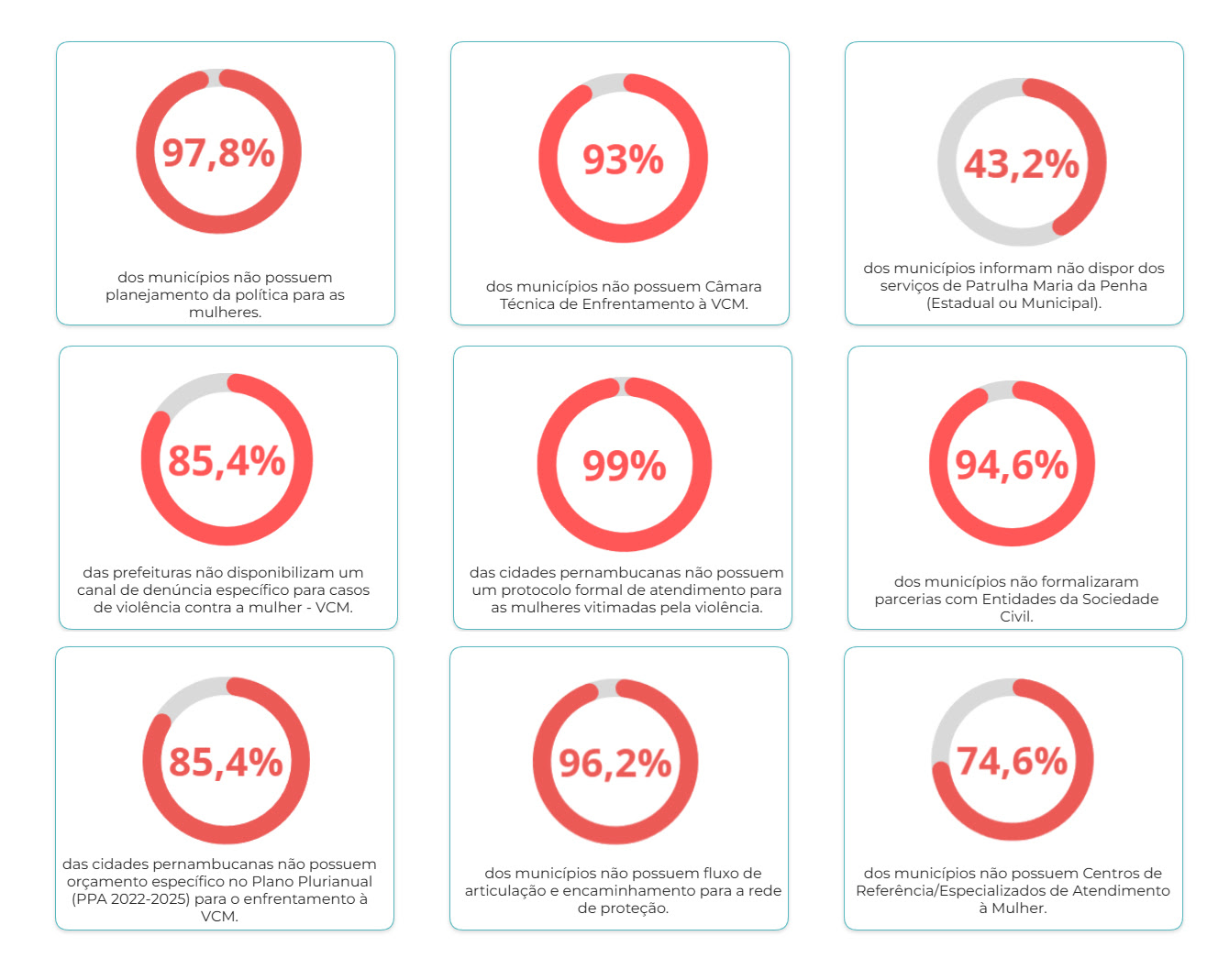 De acordo com o estudo, 98% dos municípios não têm planejamento de políticas voltadas à mulher, enquanto 85% não possuem orçamento específico para o combate ao feminicídio no Plano Plurianual. Em 43% das cidades não há patrulhamento especializado, como a Patrulha Maria da Penha.