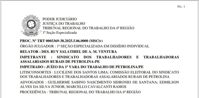 O Tribunal Regional do Trabalho da 6ª Região (TRT-6) manteve suspensos os efeitos da eleição do Sindicato dos Trabalhadores e Trabalhadoras Assalariados Rurais de Petrolina (STTAR), realizada em 25 de novembro de 2025, e negou o mandado de segurança apresentado pela entidade para tentar reverter a decisão que impediu a posse da Chapa 1, encabeçada por Maria Joelma.