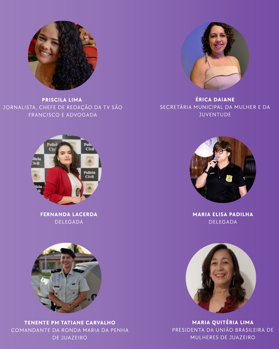 A roda de conversa contará com a participação de Priscila Lima (jornalista, chefe de redação da TV São Francisco e bacharel em direito), Érica Daiane (secretária municipal da Mulher e da Juventude de Juazeiro), Fernanda Lacerda e Maria Elisa Padilha (delegadas da Delegacia de Atendimento à Mulher – DEAM), Tenente PM Tatiane Carvalho (comandante da Ronda Maria da Penha, em Juazeiro) e Maria Quitéria Lima (presidenta da União Brasileira de Mulheres – UBM, em Juazeiro).