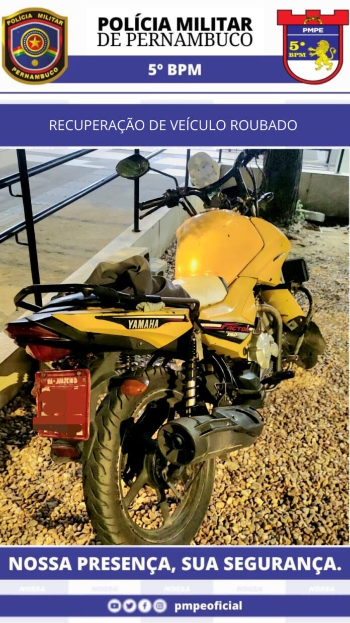 Por volta das 22h40 dessa sexta-feira (17), durante a OPERAÇÃO SENTINELA, as equipes GE Tático 5.217 e 5.232 do 5ºBPM, lograram êxito na recuperação de uma motocicleta que foi roubada no Bairro Areia Branca, em Petrolina, no último dia 12 do corrente mês. A motocicleta foi localizada no Bairro Dom Avelar.